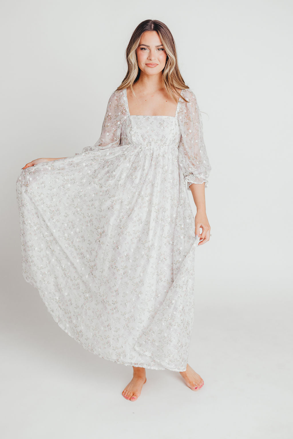 Mona Maxi Dress in Grey Floral Bump Friendly Restocking